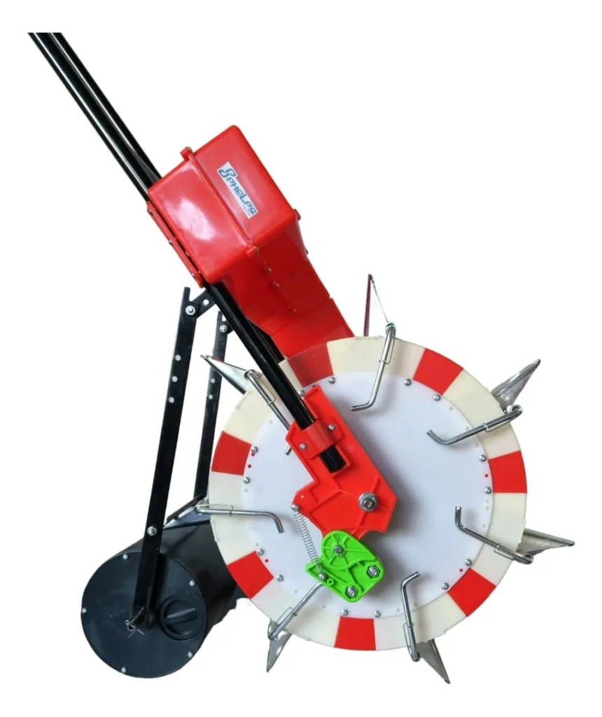 Esse é o modelo mais básico e também o mais comum. Normalmente feito em plástico e metal leve, com reservatório superior e sistema simples de queda de sementes. É indicado para hortas domésticas, pequenos canteiros e uso ocasional.